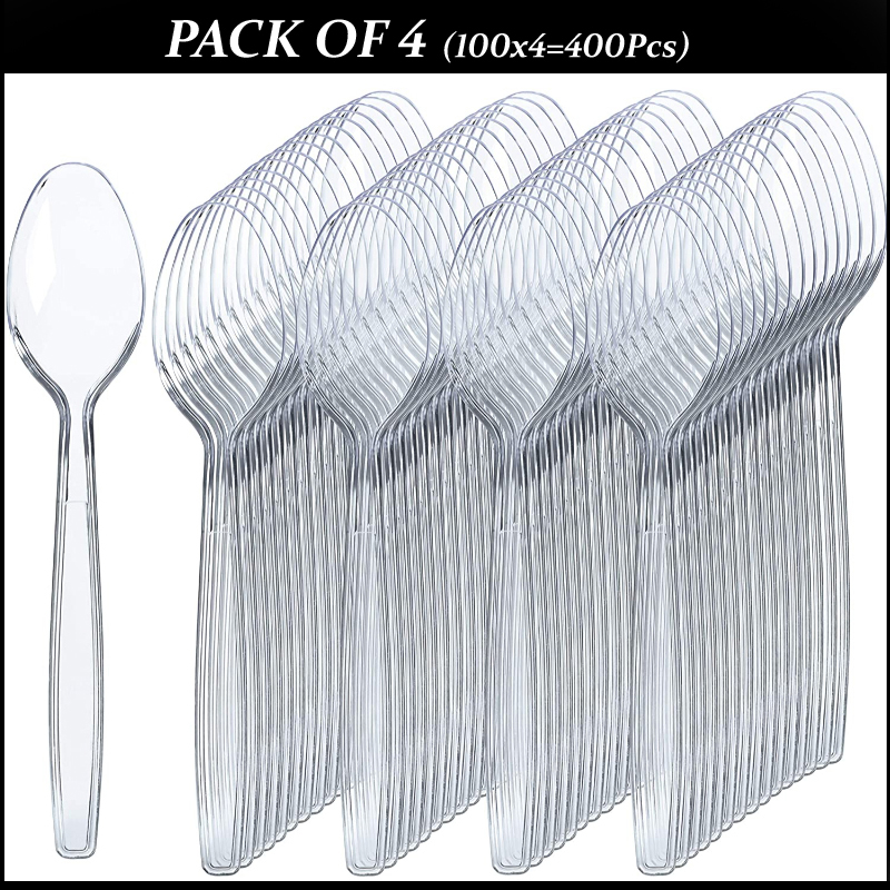 This product comprises four individual packs, each containing 100 disposable plastic spoons.