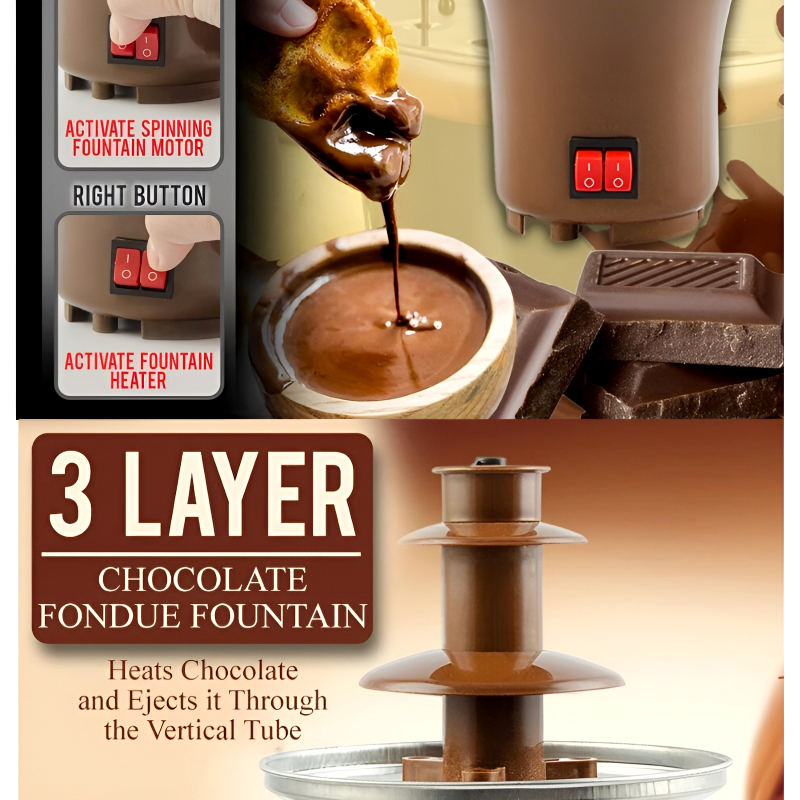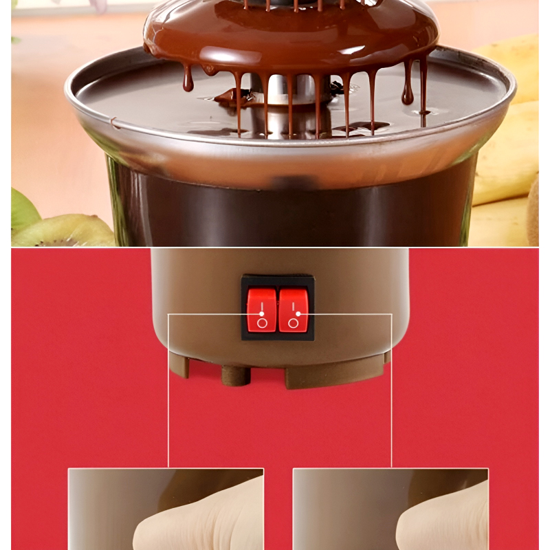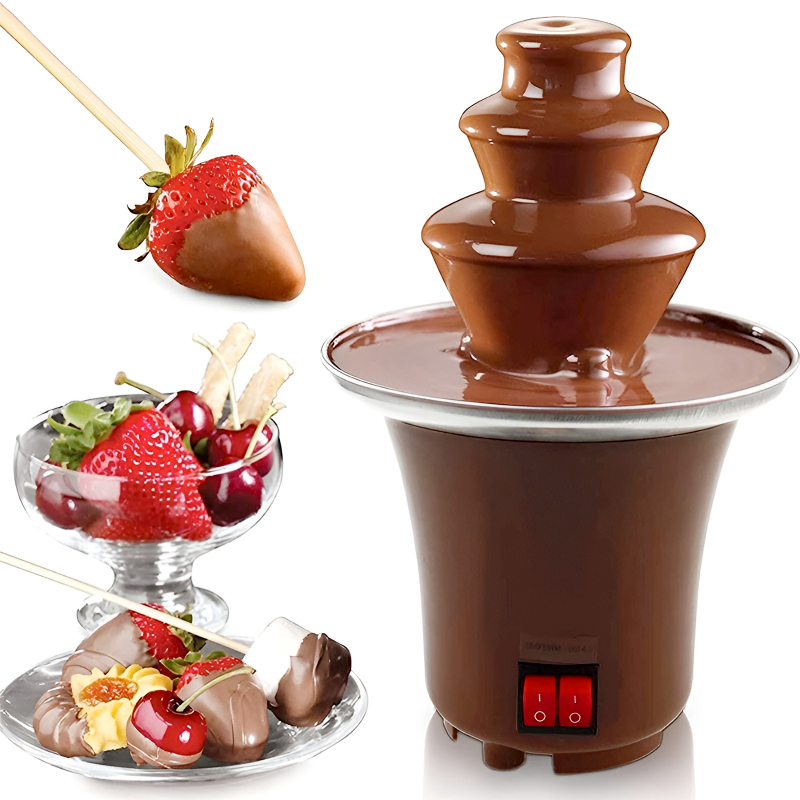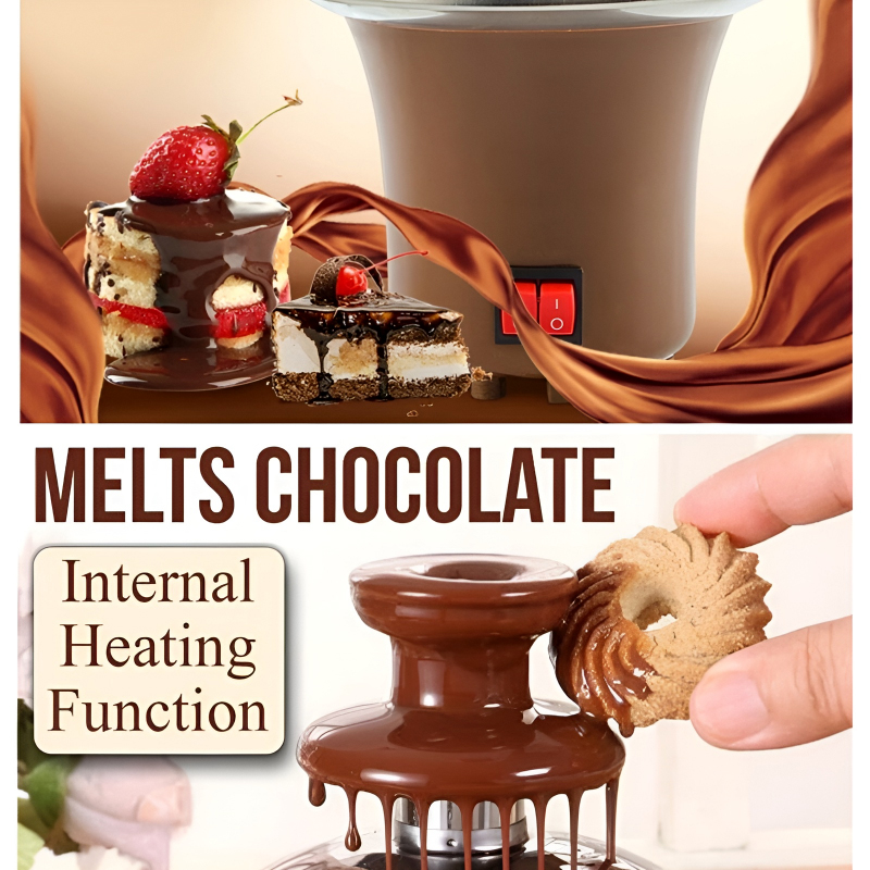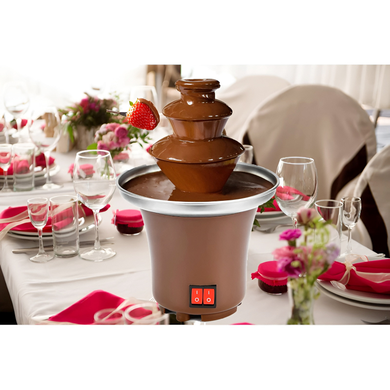 The fountain’s three-tiered design creates a beautiful cascading effect, with a spiral mechanism that keeps the chocolate flowing continuously. The heated bowl and tower ensure that your chocolate stays perfectly melted, allowing for even dipping of your favorite treats.