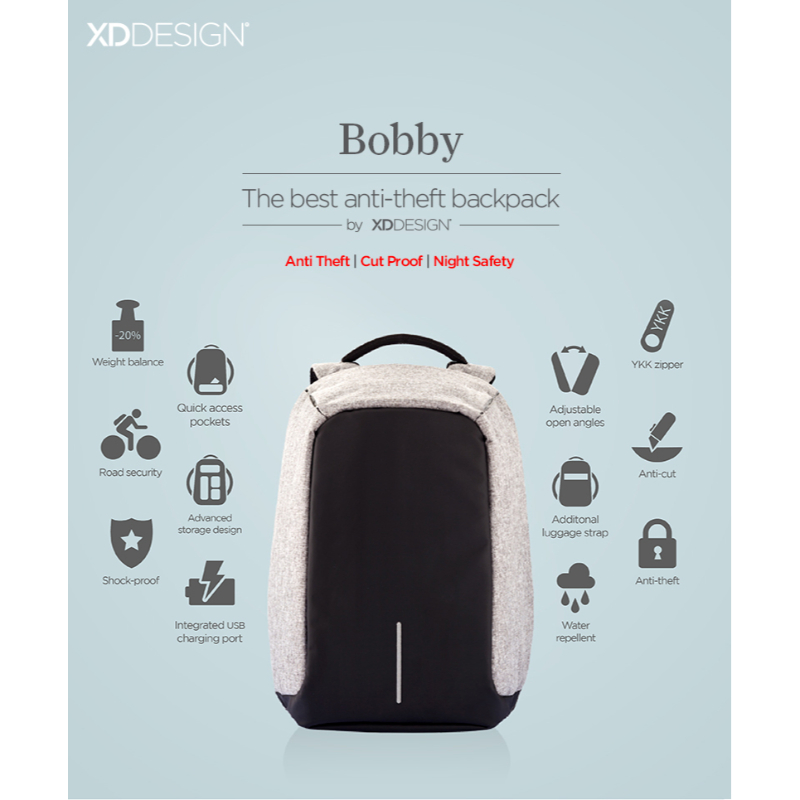 The backpack is equipped with multiple anti-theft features such as hidden zippers, lockable compartments, and slash-resistant materials.