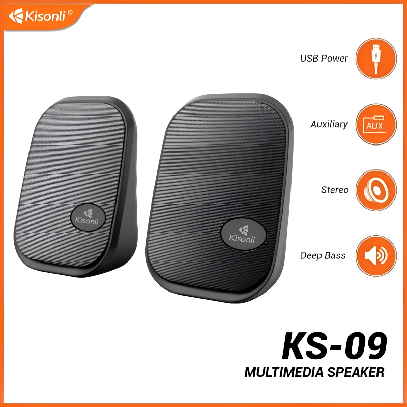 Kisonli KS-09 USB 2.0 Stereo Multimedia Speakers – Dual 3W Output, AUX & USB Powered, Compact Design for Desktop, Laptop, Mobile & Tablets