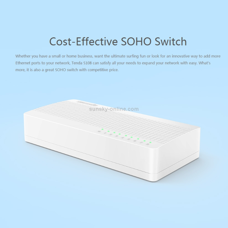 The Tenda S108 is a compact, unmanaged 8-port Fast Ethernet switch designed for expanding wired networks in homes,